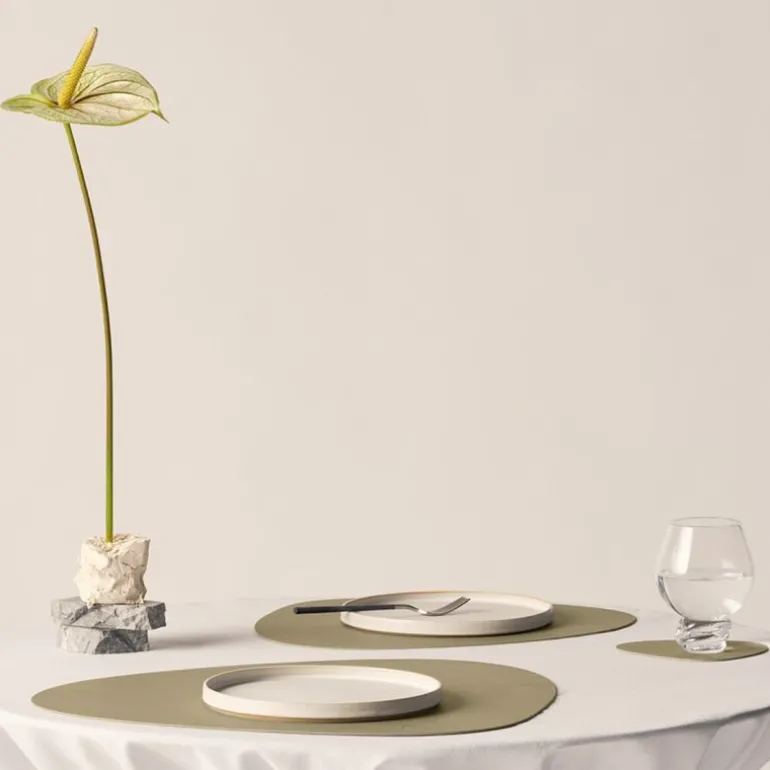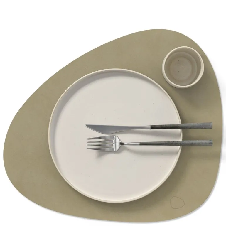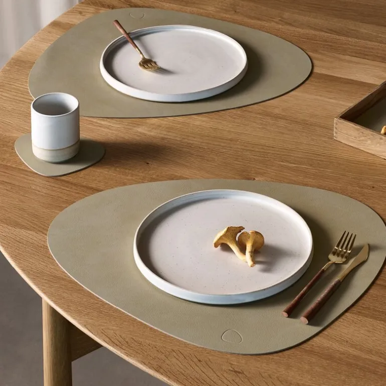 Curve Nupo spisebrikke L 37×44 cm herbal dust. TABLE MAT DOUBLE CURVE fra LIND DNA er en funksjonell og stilfull spisebrikke, designet for maksimal fleksibilitet. Denne tosidige spisebrikken er laget av OEKO-TEX®-sertifisert resirkulert skinn, og har ulike farger og overflater på hver side, noe som gjør det enkelt å endre utseendet på bordet ved å snu den.