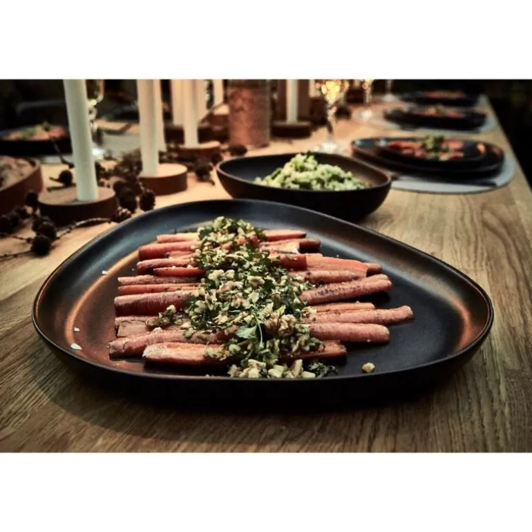 Curve Stoneware serveringsfat 35×30 cm svart. Den karakteristiske buede formen på det håndlagde Curve Stoneware serveringsfatet gir deg muligheten til å leke enda mer med borddekkingen din ved å tilføye en ny dimensjon av kurver. Ved å kombinere dine LIND DNA spisebrikker med vårt matchende service i stein, skaper du den perfekte harmonien på bordet ditt – i hverdagen så vel som til festlige anledninger.