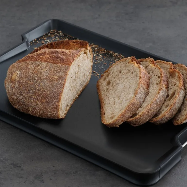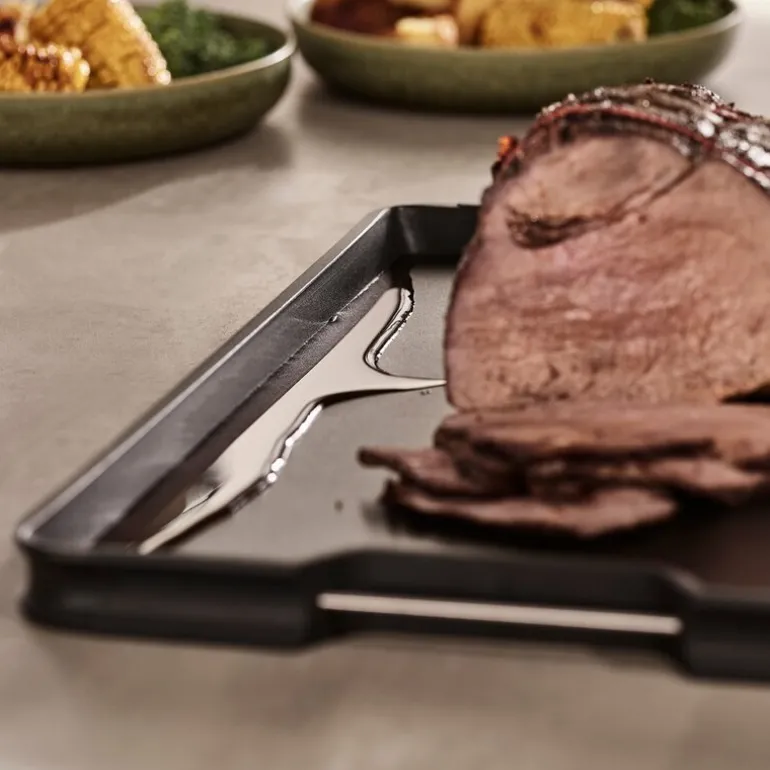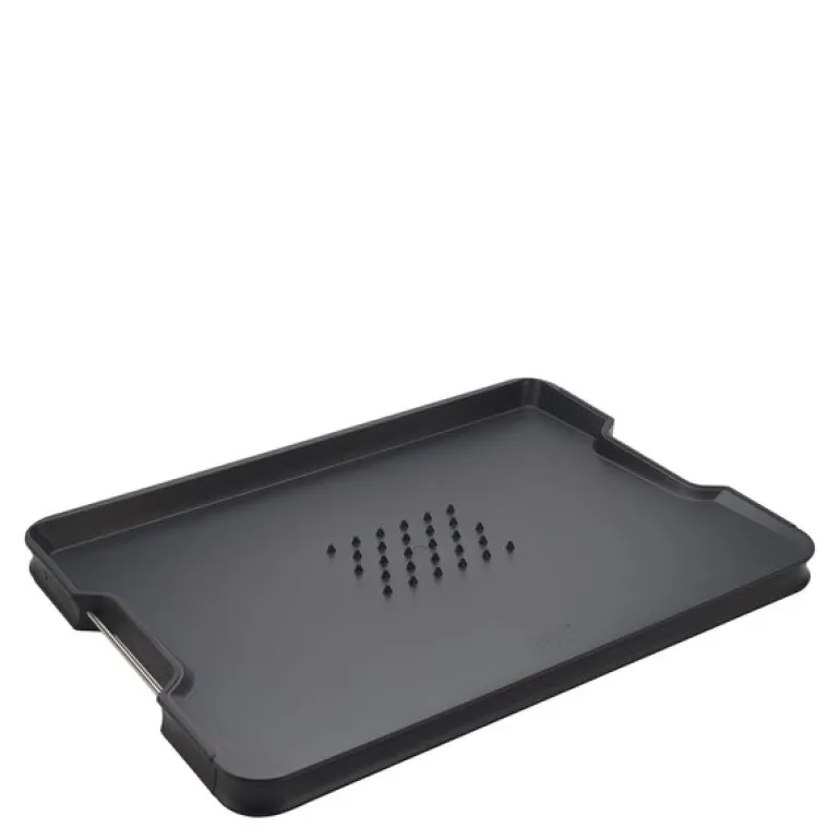 Cut&carve Plus skjærebrett 41×29 cm svart fra Joseph Joseph. Dette dobbeltsidige skjærebrettet med innovative funksjoner. Den har en unik vinklet base, hevede kanter og lett-helle hjørner, som alle hjelper til med oppsamling og avhending av smuler eller væsker ved skjæring eller utskjæring. På den ene siden av brettet er det et integrert kjøttgrep for ekstra hjelp ved skjæring, mens den andre siden gir en jevn skjæreflate for generell matlaging. Sklisikkere kanter sørger for at brettet holder seg på plass under bruk, og denne helt nye designen har nå håndtak i rustfritt stål på sidene for enklere løfting og bæring.