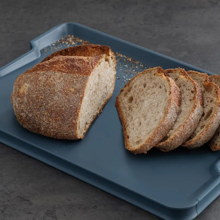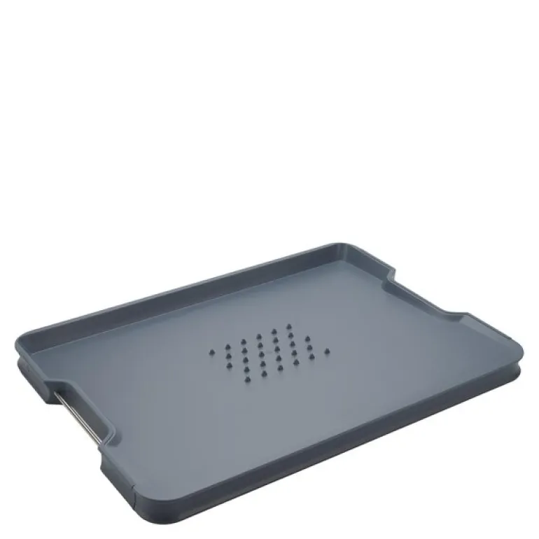 Cut&carve Plus sky skjærebrett 29×41 cm blå fra Joseph Joseph. Dette dobbeltsidige skjærebrettet med flere funksjoner er fullpakket med innovative funksjoner. Den har en unik vinklet base, hevede kanter og lett-helle hjørner, som alle hjelper til med oppsamling og avhending av smuler eller væsker ved skjæring eller utskjæring. På den ene siden av brettet er det et integrert kjøttgrep for ekstra hjelp ved skjæring, mens den andre siden gir en jevn skjæreflate for generell matlaging. Sklisikkere kanter sørger for at brettet holder seg på plass under bruk, og denne helt nye designen har nå håndtak i rustfritt stål på sidene for enklere løfting og bæring.