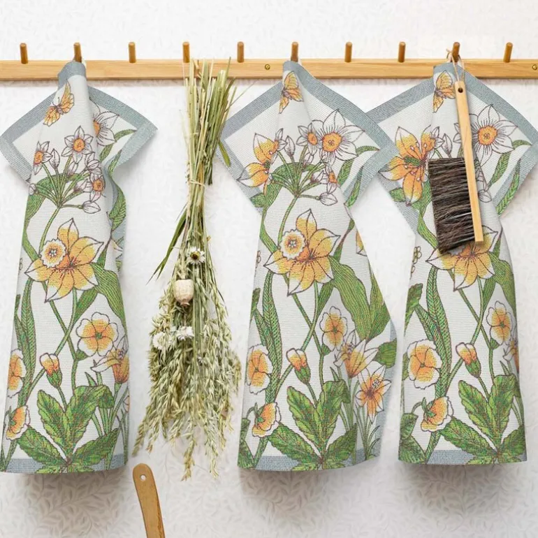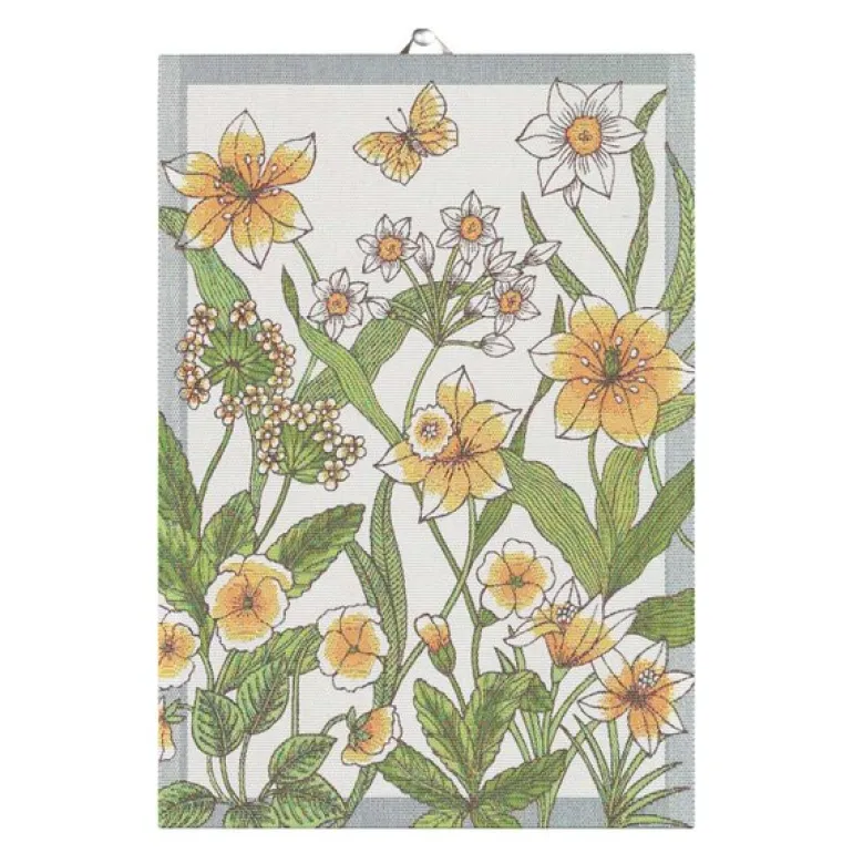 Daffodil håndkle fra Ekelund bringer et lyst og vårlig preg inn i hjemmet med sitt gule fargetema og blomstrende design. Størrelsen på 35×50 cm gjør det ideelt til bruk på kjøkkenet, som et lite gjestehåndkle eller som dekorativt innslag i interiøret. Mønsteret skaper en frisk og livlig stemning, og passer godt til både hverdag og høytid.