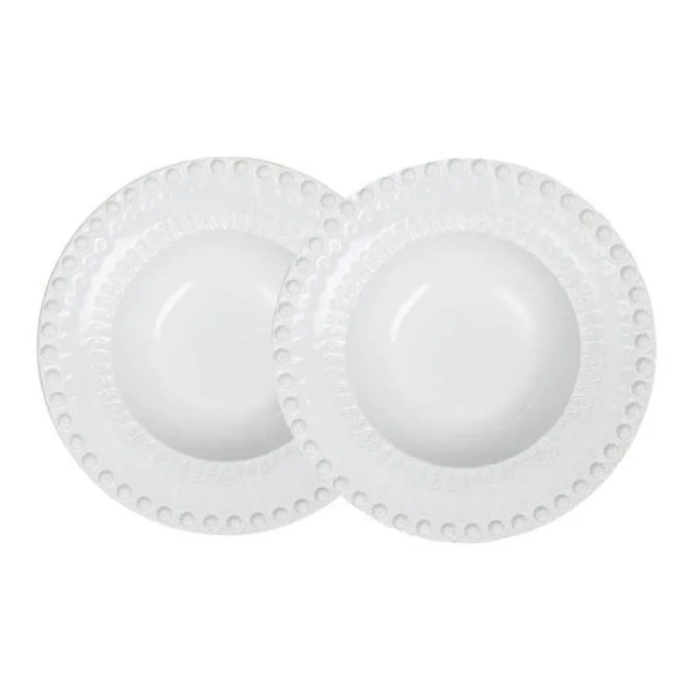 DAISY dyp tallerken 21 cm 2 stk hvit fra PotteryJo. Vakker dyp tallerken i relieffmønstret leirgods. DAISY er et vintage design, omarbeidet av dyktige pottemakere, og inspirert av en antikk krukke fra 1800-tallet. Navnet DAISY kommer fra blomstermotivet som pryder kantene på produktene.