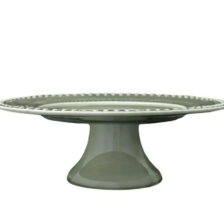 DAISY kakefat 35 cm faded army fra PotteryJo. Vakkert stort kakefat på stett i relieffmønstret leirgods. DAISY er et vintage design, omarbeidet av dyktige pottemakere, og inspirert av en antikk krukke fra 1800-tallet. Navnet DAISY kommer fra blomstermotivet som pryder kantene på produktene.