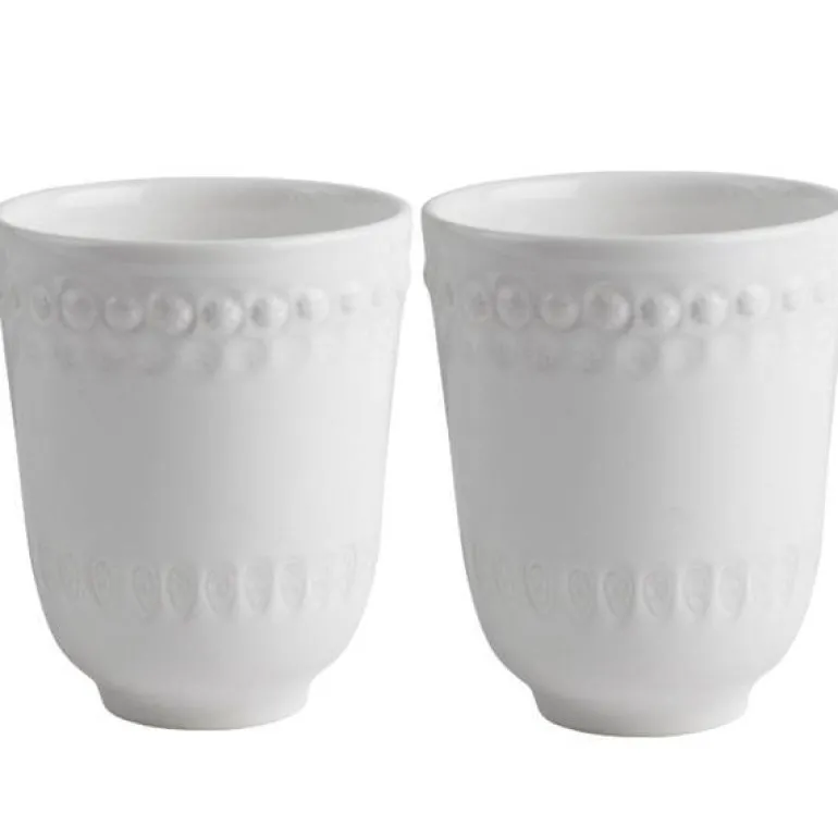 DAISY krus 35 cl 2 stk hvit fra PotteryJo. Håndlaget krus i relieffmønstret leirgods. DAISY er et vintage design, omarbeidet av dyktige pottemakere, og inspirert av en antikk krukke fra 1800-tallet. Navnet DAISY kommer fra blomstermotivet som pryder kantene på produktene.