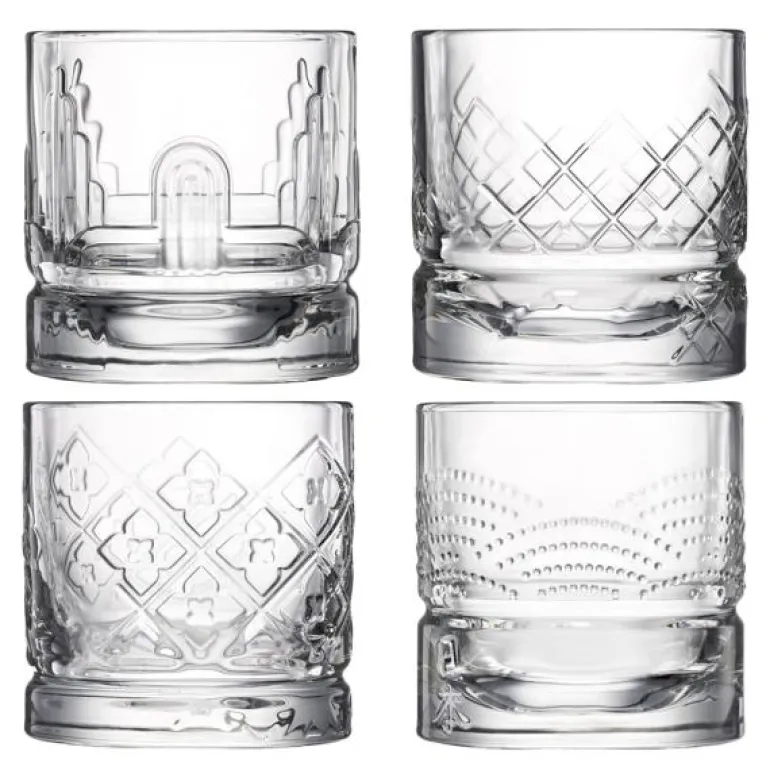 Whiskyglass Dandy 4 stk fra franske La Rochere. Glasset har en sterk base som går over i arkitektoniske mønstre som gir fint lys til whiskyen. Rommer 30 cl. Dandy-serien er designet av Studio La Racine og har fire symbolske mønstre som skaper lyseffekter og forsterker nyansene til whisky. De fire glassene kommer i en gaveeske – ett av hvert av de fire mønsterne.