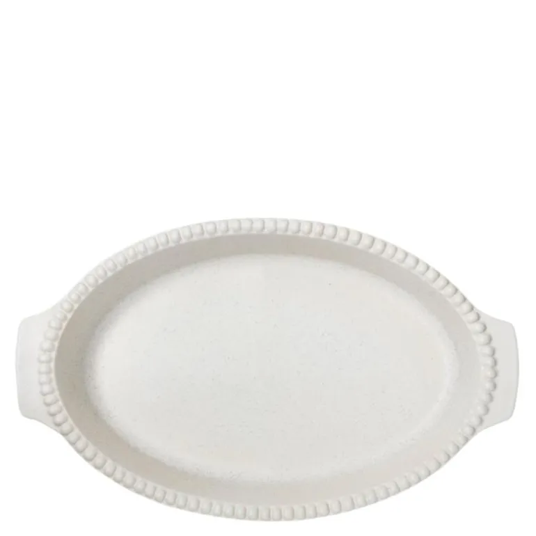 DARIA ovnsform 35 cm cotton white. Stor håndlaget ovnsform i relieffmønstret stengods. PotteryJo er laget med omhu i høykvalitets steintøy og keramikk – skapt, brent og håndlaget i Portugal, designet i Sverige. Den elegante og slitesterke DARIA-kolleksjonen er inspirert av plantenes livssyklus, spesielt spiringsprosessen og deres transformasjon. Denne kolleksjonen fremkaller en følelse av trygghet og håp om fornyelse, og representerer en organisk utforskning som har resultert i en kolleksjon av tidløse og elskede familiemedlemmer.