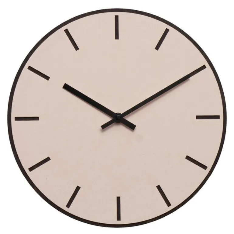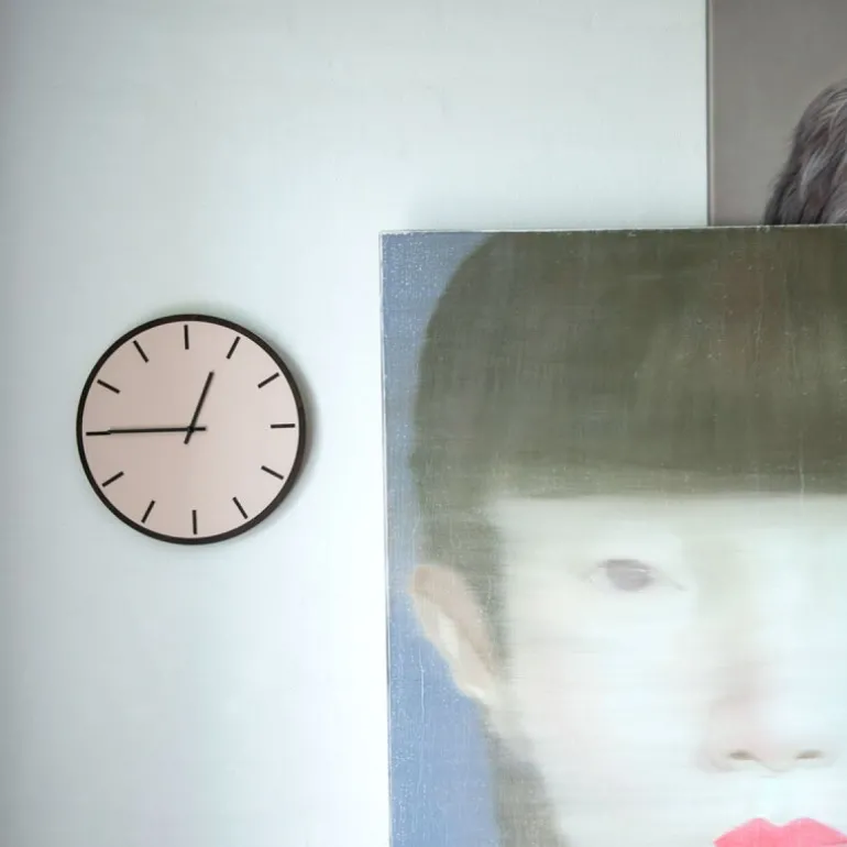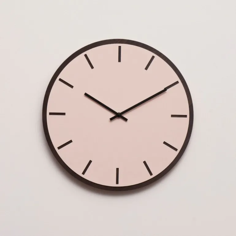 Urtavlen, laget av mørk eikefiner og belagt med dimrosa linoleum, tilbyr en harmonisk blanding av natur og modernitet. De svarte viserne forsterker klokkens tidløse design og gjør den til et utmerket valg for det moderne nordiske hjemmet.