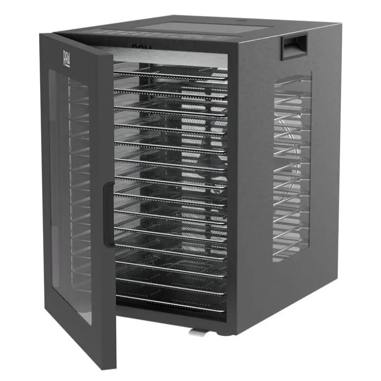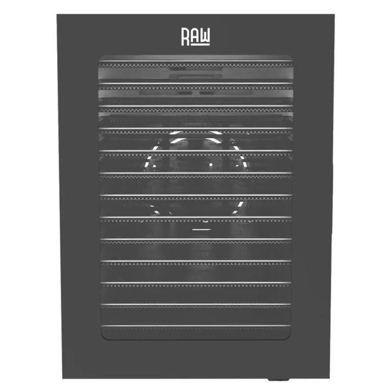 RAW Dehydrator med 14 hyller DH14 i svart er en romslig dehydrator for deg som ønsker å bevare matvarer på en enkel og effektiv måte. Med hele 14 hyller i rustfritt stål, hver på 28,7 x 28,7 cm, får du et samlet tørkeområde på 1,15 m².