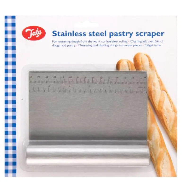 Praktisk deigskrape i rustfritt stål fra Tala. Deigskrapen har målestokk, og er super til å måle og dele deig, samt løsne deig fra arbeidsflaten etter kjevling. Tåler vask i oppvaskmaskin.