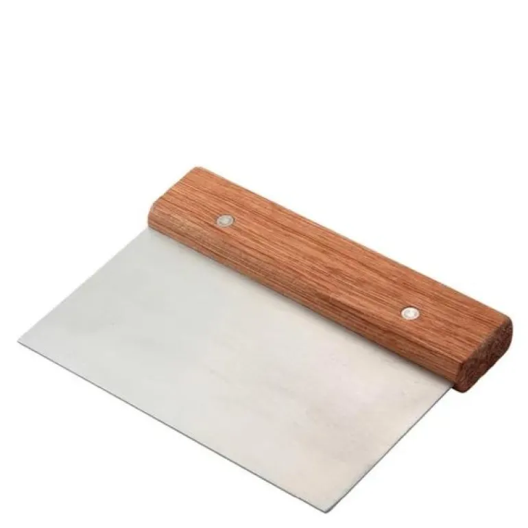 Praktisk deigskrape i rustfritt stål med håndtak i rosentre. Skrapen, fra det finske merket Heirol, kan brukes til å porsjonere ut deig eller rengjøre arbeidsflaten etter baking. For å få like store boller hver gang er den merket med mål på den rustfrie delen.