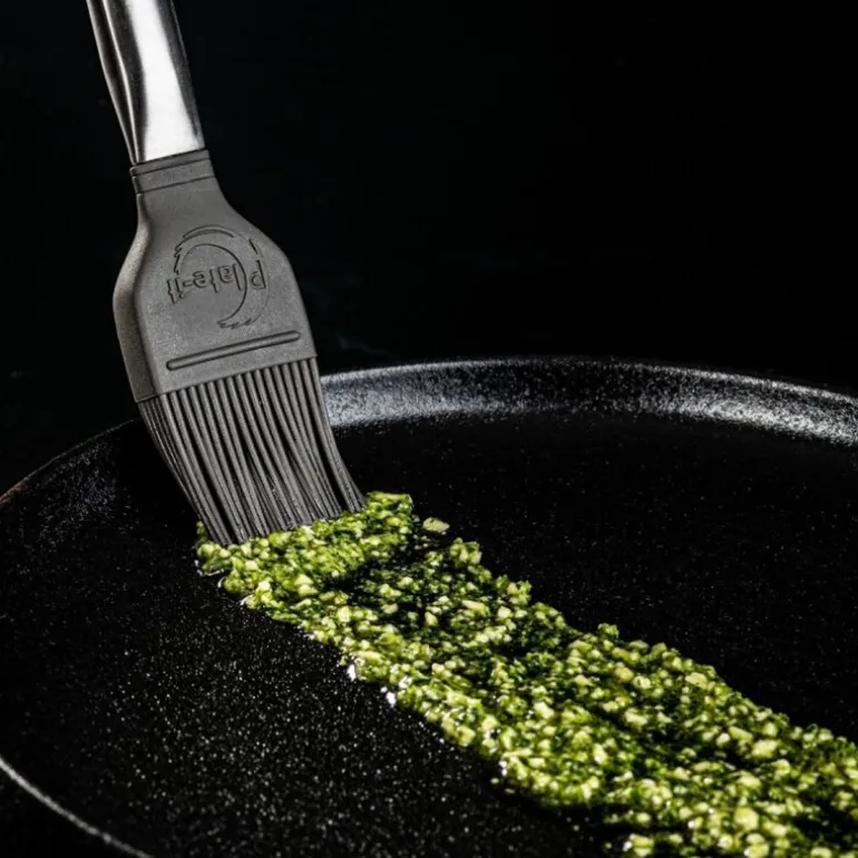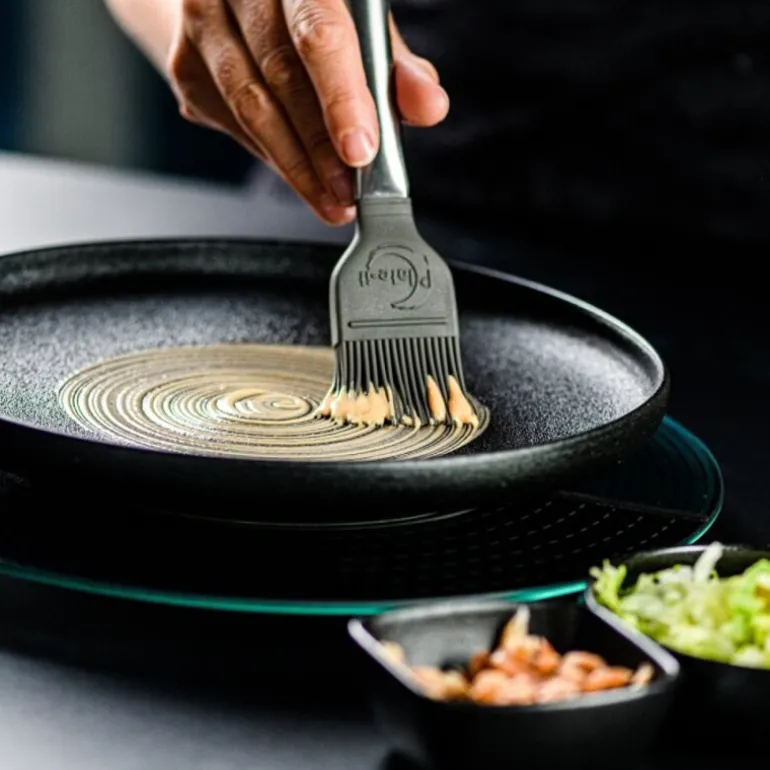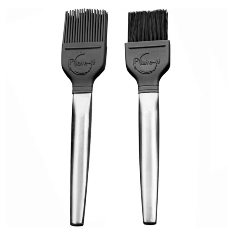 Penselsettet fra Plate It består av to praktiske kjøkkenpensler med ulike egenskaper. Gummibusten er robust og ideell for grovere arbeid, som å smøre bakeformer eller jobbe med tykkere masser. Nylonbusten gir derimot en lett og jevn påføring, perfekt for å dra ut en dråpe saus eller puré i ønsket form ved plating.
