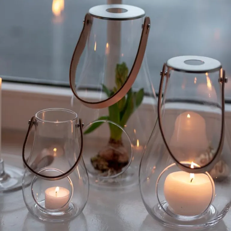 Maria Berntsen har designet denne mobile lanternen i glass, med hank i fullnarvet skinn for å skape den særegne skandinaviske atmosfæren hvor som helst. En ideell gaveide for en spesiell anledning.