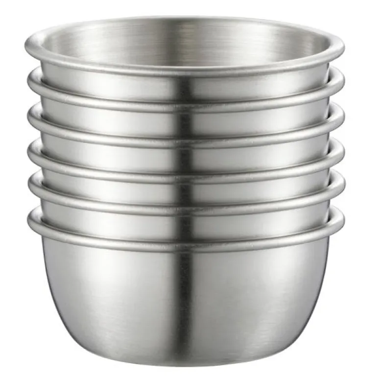 Et sett med 6 dippeskåler laget av rustfritt stål. Hver skål måler 6 x 2,6 cm og er perfekt for å servere dipper eller sauser.