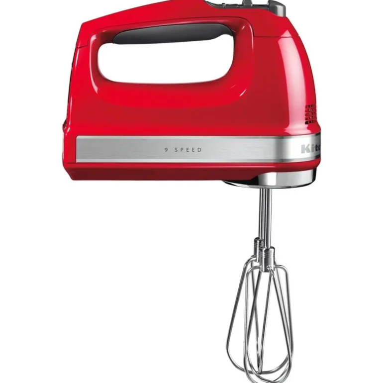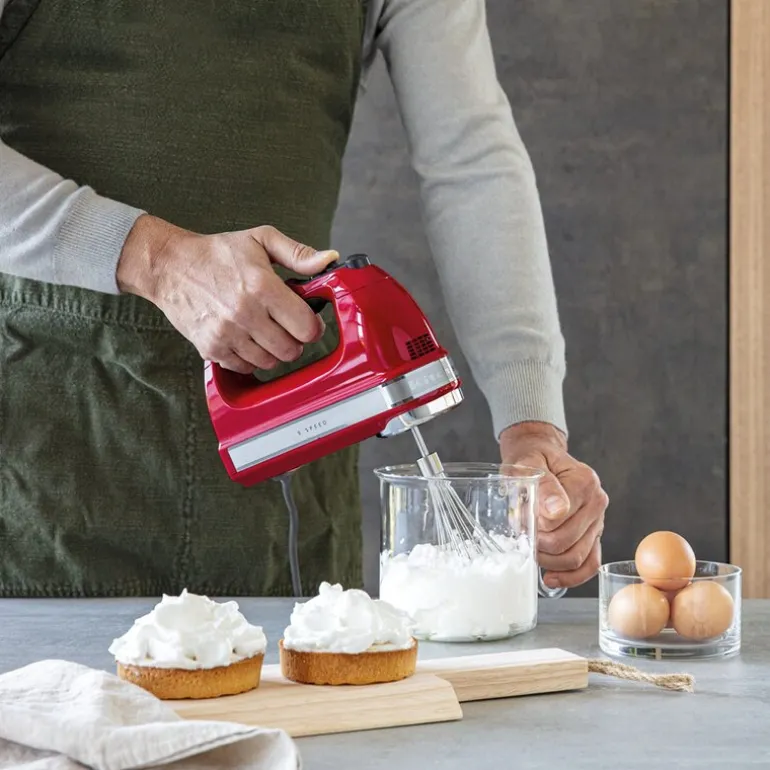 KitchenAid Digital Håndmikser 5KHM9212EER i den stilige fargen Empire Red – et praktisk redskap som gir deg kreativ frihet på kjøkkenet. Med ni hastigheter lar denne håndmikseren deg tilpasse hastigheten til alle typer oppskrifter, enten du skal røre forsiktig i sauser eller mikse tunge deiger. Ved lavere hastigheter unngår du søl, ideelt for flytende blandinger, mens høyere hastigheter takler tykkere rører med letthet. Toppnivået sørger for luftig pisking av eggehviter, og gir perfekte resultater hver gang.