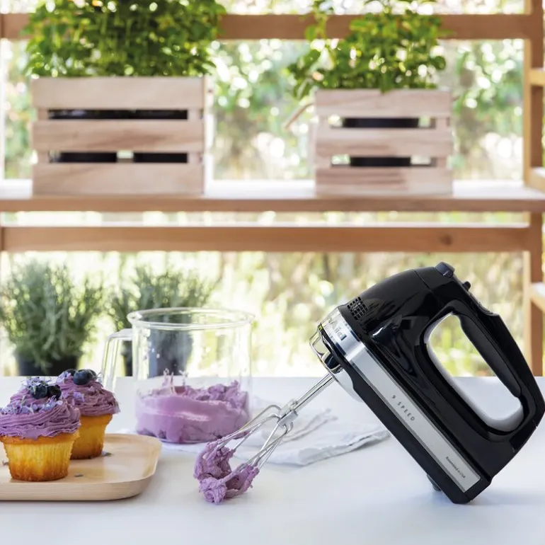 KitchenAid Digital håndmikser 5KHM9212EOB i onyx black er et pålitelig og kraftig kjøkkenredskap med et bredt utvalg av nyttige funksjoner. Denne håndmikseren tilbyr imponerende 9 ulike hastighetsinnstillinger, som enkelt justeres med presis elektronisk kontroll. Dette gir deg muligheten til å tilpasse hastigheten etter oppgaven, enten det er lett blanding eller intensiv visping.