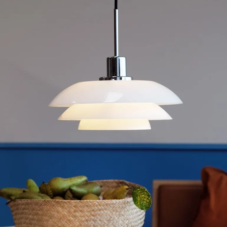 DL31 pendel er spesielt designet for å gi et behagelig og blendefritt lys, noe som gjør den ideell for plassering over spisebordet, kjøkkenøya eller som allmennbelysning i større rom. Opalglassmodellen sprer lyset mykt og jevnt, og tilfører rommet en varm og innbydende atmosfære, mens metallvarianten fokuserer lyset direkte nedover, noe som gir en mer intim og romdelt følelse.