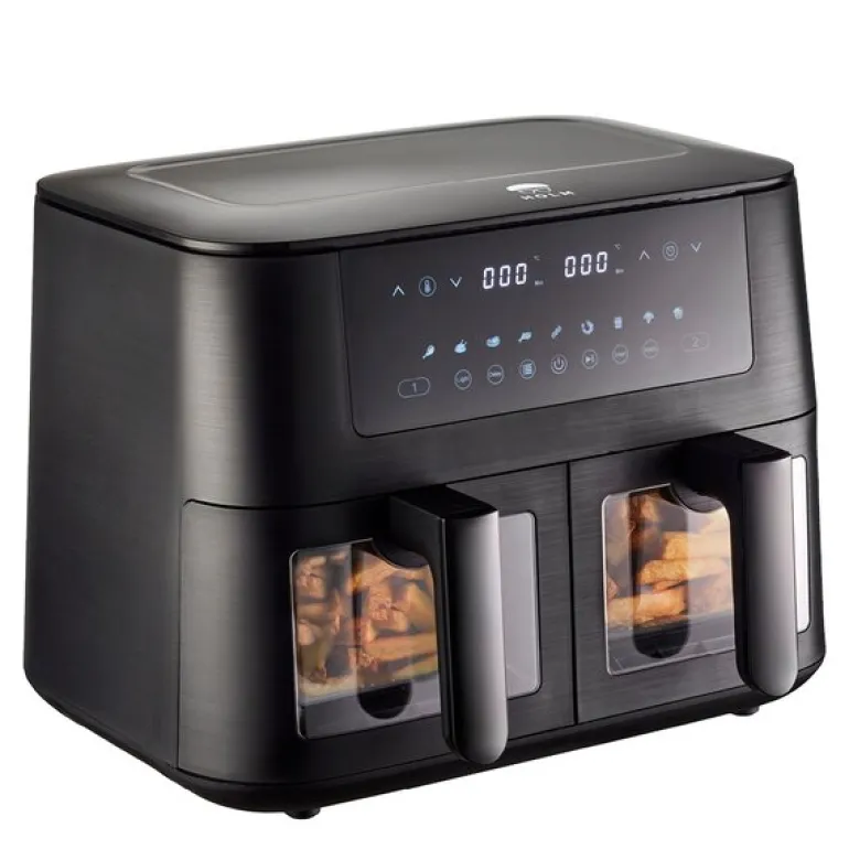 Skuffene har praktisk non-stick-belegg som gjør rengjøringen enkel, og vinduene i begge skuffene lar deg følge med på matens tilberedning. Airfryeren har ni ferdige programmer, temperaturjustering fra 80 til 200 °C, og et tidsur for nøyaktig kontroll. Det digitale displayet gjør den enkel å betjene, og med automatisk avstenging og overopphetingsvern er sikkerheten ivaretatt.