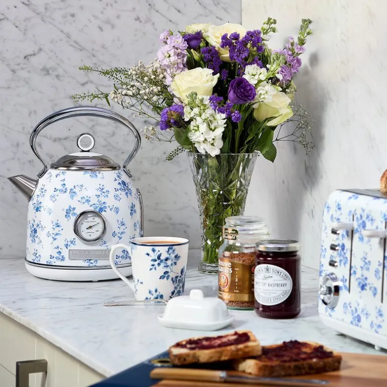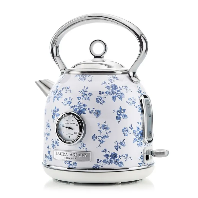 Dome elektrisk vannkoker fra Laura Ashley i China Rose blå/hvit kombinerer klassisk mønster med moderne bruksegenskaper. Med en kapasitet på 1,7 liter er den godt egnet til både små og større mengder vann, og det innebygde termometeret gjør det mulig å følge temperaturen under oppvarming – perfekt for deg som bryr deg om detaljene i drikken.