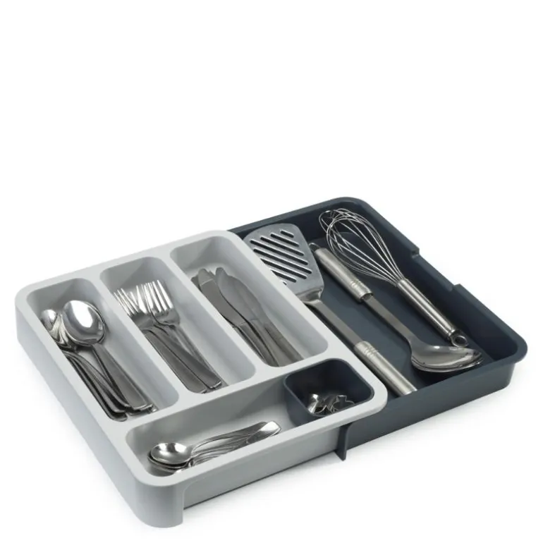 Denne smarte oppbevaringsløsningen fra Joseph Joseph er perfekt for å organisere rotete bestikkskuffer. Med to justerbare halvdeler kan brettet tilpasses forskjellige skuffestørrelser og låses sikkert sammen for å sikre stabilitet.