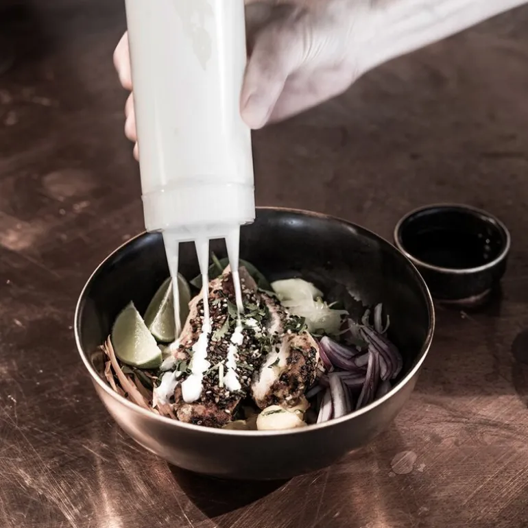 De tre tutene gir mulighet for jevn og kontrollert påføring av sauser og dressinger, noe som gjør serveringen rask og presis. Flasken er laget for å tåle intensiv bruk og rengjøring, og er et pålitelig valg for daglig drift.