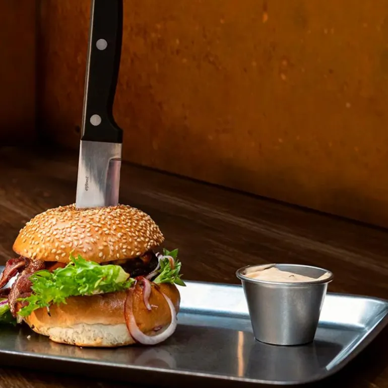 Dressingkopp i rustfritt stål med en kapasitet på 7 cl er et praktisk og tidløst alternativ for servering av små porsjoner sauser som ketchup eller dressing. Med sitt elegante vintage-preg passer den perfekt i alt fra moderne restauranter til klassiske serveringsmiljøer.