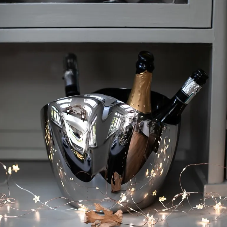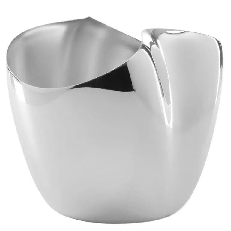 Laget av høyglanspolert 18/10 rustfritt stål, reflekterer kjøleren omgivelsene på en måte som skaper vakre lysspill. Den myke, bølgende formen gir den et organisk og sofistikert uttrykk, og den er like imponerende fylt som tom. Med målene 21,5 cm i dybde, 23 cm i høyde og 28 cm i bredde, rommer den enkelt to flasker champagne eller tre flasker vin, noe som gjør den praktisk for både intime middager og større feiringer.