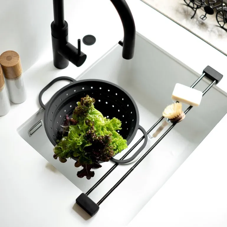 Drip.line tilbyr en super løsning for dette problemet. Med dette uttrekkbare kjøkkentilbehøret kan du tørke det meste, og la det dryppe ned i vasken.