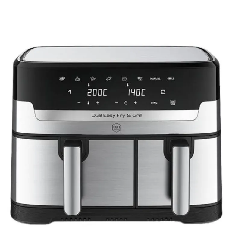 Dual Easy Fry & Grill fra OBH Nordica er en air fryer med stor kapasitet. Takket være de to forskjellige skuffene for matlaging kan du enkelt tilberede et komplett hjemmelaget måltid til deg selv og familien på én gang. Dual Easy Fry & Grill har to skuffer. Den ene er ekstra stor og rommer 5,2 liter, mens den andre i vanlig størrelse rommer 3,1 liter. De fungerer uavhengig av hverandre, som betyr at du kan bruke dem til å lage forskjellige retter i hver skuff samtidig. 5,2 liters skuffen inneholder en formstøpt grillrist som passer til alle funksjoner, men er spesielt egnet for grilling. Den andre skuffen på 3,1 liter inneholder en vanlig rist, som ikke må brukes sammen med grillfunksjonen.