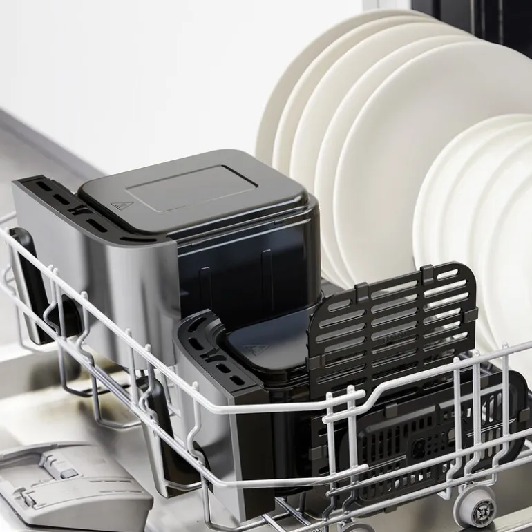 Når du kjøper Dual Easy Fry & Grill følger det med en innebygd og formstøpt grillrist til den store skuffen, en vanlig rist til den lille skuffen, instruksjoner om hvordan du kommer i gang med å bruke airfryeren og en bruksanvisning.