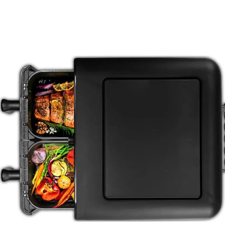 Sabor Duett airfryer dobbel i matt svart, med total kapasitet på 11 liter, er en innovativ og effektiv løsning for sunn matlaging, perfekt for familier eller de som ønsker å tilberede flere retter samtidig. Denne kraftige airfryeren har to separate skuffer, hver med en kapasitet på 5,5 liter, som gjør det mulig å tilberede to måltider med ulike temperaturer og innstillinger samtidig. Dette gir deg full fleksibilitet til å lage sprø, velsmakende retter med minimalt bruk av fett, takket være den hurtig-sirkulerende varmluften som gir en sprø overflate og saftig innside.