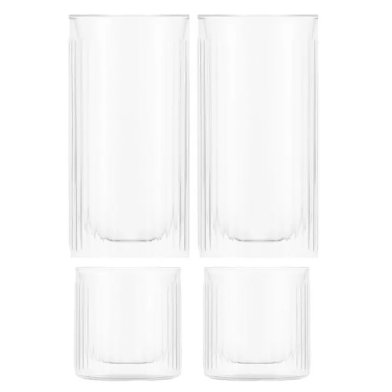 Douro Bar whiskey- og ginglass fra Bodum kombinerer elegant design med funksjonalitet. Settet inneholder fire klare glass på 30 cl, laget med dobbelvegg for optimal isolasjon. Det stilrene designet med subtile striper gjør dem like dekorative som praktiske, enten du serverer en klassisk whiskey eller en frisk Gin & Tonic.