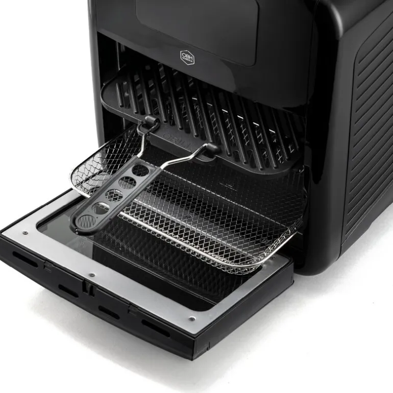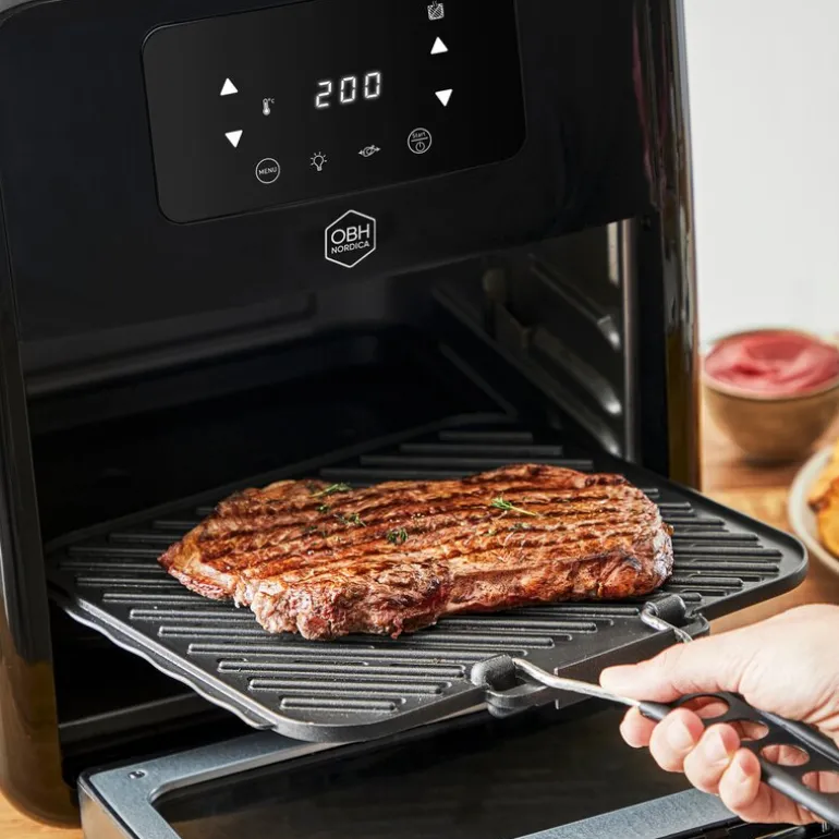 Med OBH Nordica sin airfryer, Easy Fry Oven & Grill 9-in-1, får du en luftfrityrkoker med både stekeovn og grillfunksjon og XXL kapasitet på 11 liter. For godt tilberedt mat til familien eller et større selskap. Airfryeren har et effektivt luftsirkulasjonssystem som optimerer luftstrømmen slik at maten blir sprø på utsiden og mør og saftig på innsiden med lite eller ingen olje. Dette gjør det også til et sunnere alternativ. Hvis du har lengtet etter å kunne tilberede en perfekt grillet kylling, så er denne airfryeren løsningen for deg, siden den er utstyrt med et roterende grillspyd (rotisserie). Dette betyr at kyllingen kan rotere mens du steker den, og gir et perfekt jevnt grillresultat.