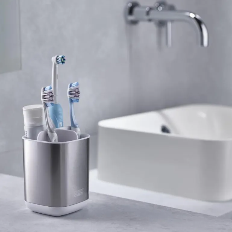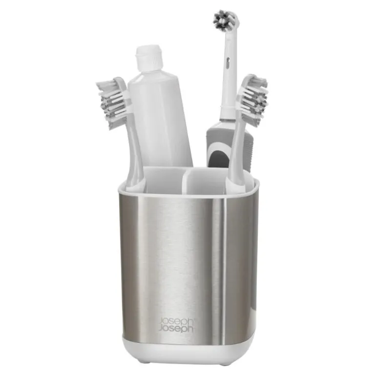 Denne kompakte tannbørste-caddyen er delt inn i tre seksjoner som gir organisert lagring for en rekke munnpleieprodukter, for eksempel manuelle / elektriske tannbørster og tannkremer.