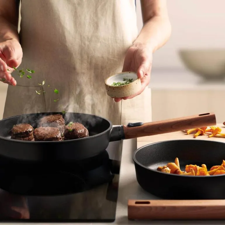 - Rengjør alltid pannen etter bruk med mildt oppvaskmiddel og en myk svamp for å beskytte den PFAS-frie non-stick-belegningen. Unngå bruk av stålull eller grove børster som kan ripe opp overflaten. Selv om pannen tåler oppvaskmaskin, anbefales håndvask for å forlenge beleggets levetid. Skånsom rengjøring for hånd vil bidra til at pannen beholder sine gode egenskaper over tid. Fjern håndtaket før evt pannen settes i oppvaskmaskinen. Håndtaket rengjøres med en fuktig klut. Unngå å bløtlegge treverket, da dette kan skade materialet. La alltid pannen kjøle seg helt ned før du skyller eller vasker den med vann. Rask nedkjøling kan føre til at materialet svekkes eller sprekker på sikt.