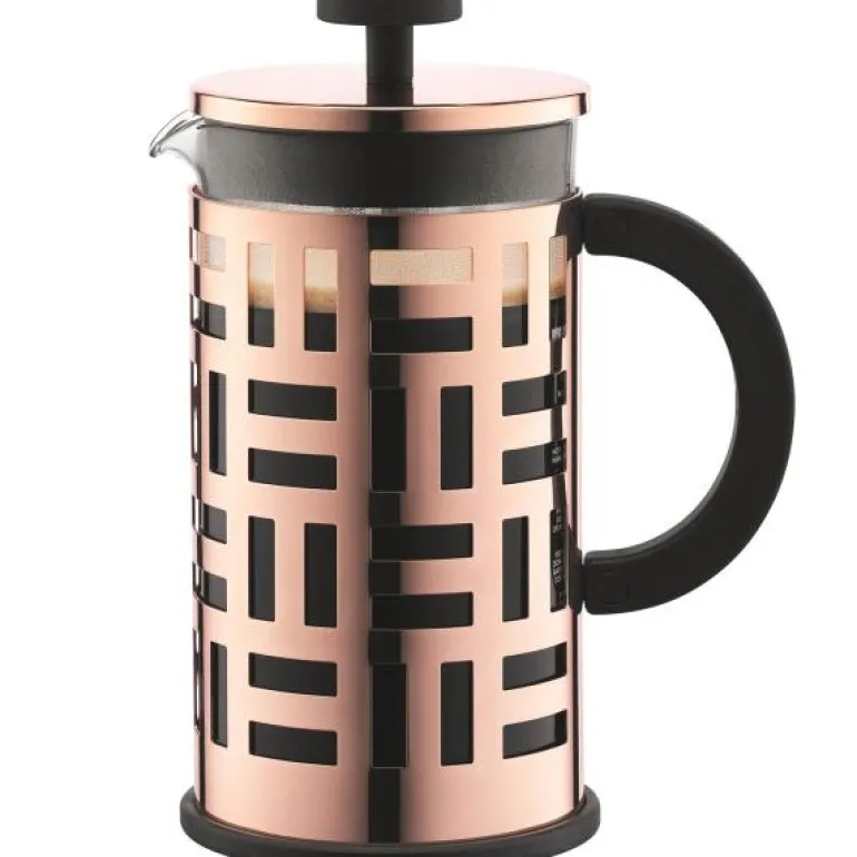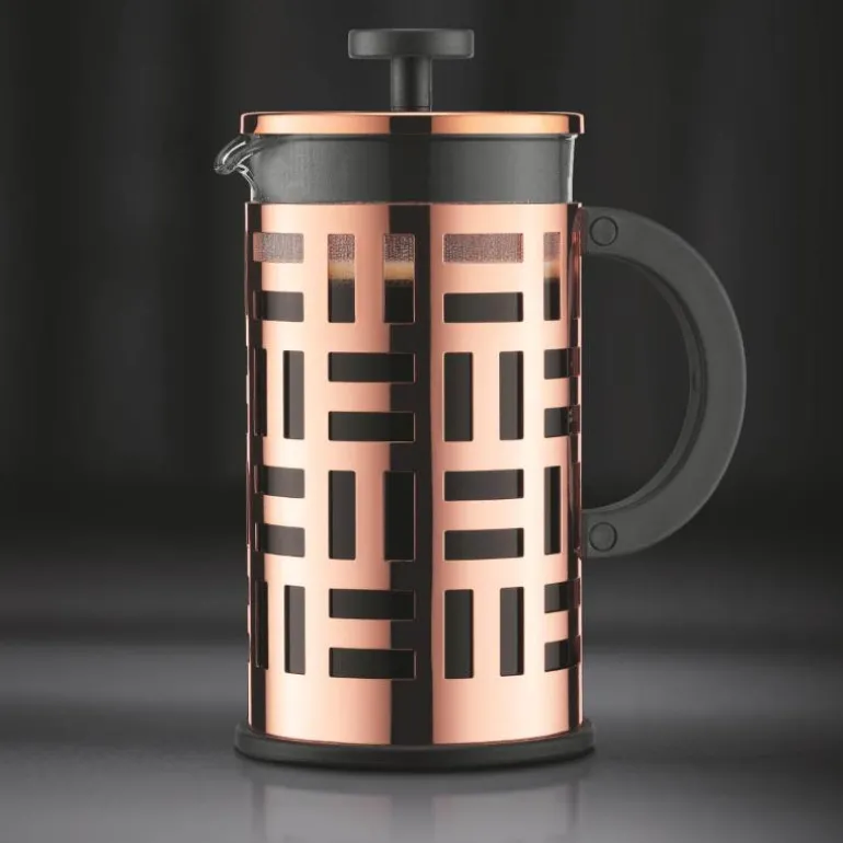 Legg til litt designerstil til salongbordet ditt med EILEEN presskanne. Inspirert av den store irske designeren Eileen Gray.Bodums pressesystem er elsket av kaffeelskere over hele verden for sin enkle måte å presse på og sin rene smak – det forvandler grovmalte bønner til den mest energigivende drikken på få minutter. Alt uten bruk av plastkapsler, sviende papirfiltre og alt annet innen moderne kaffepressing.Ved å kombinere den klassiske smaken av en stempelkanne med et dristig og moderne design, lar EILEEN stempelkanne deg presse og underholde med stil. Det vil også være en flott gave til kaffeelskeren i livet ditt.Nøkkelfunksjoner og fordelerStilig stempelkanne som bringer full smak og aroma ut av presset dittDesignet som en hyllest til den fantastiske irske designeren Eileen GrayMuggen er laget av ulastelig, varmebestandig borosilikatglass, som ikke endrer eller gjenoppretter kaffens naturlige smakMuggen er beskyttet av en rustfri stålramme med en dristig geometrisk designErgonomisk håndtak gir et sikkert og komfortabelt grepEt stempel i rustfritt stål hindrer malte bønner i å slippe ut når kaffen skjenkesMer miljøvennlig enn mange andre kaffepressemetoder – ingen papirfiltre eller plastkapsler nødvendigTilgjengelig i et utvalg sofistikerte detaljerEnkel å bruke og lett å rengjøreKan vaskes i oppvaskmaskin (unntatt kobberdesign)Slik fungerer detStempelkannesystemet er den enkleste måten å presse rik, smakfull kaffe på.Plasser EILEEN på et flatt underlag, hold i håndtaket og trekk stempelet opp og ut av karaffelen.Tilsett en teskje (med topp) eller en Bodum-måleskje grovkvernet kaffe per kopp / 120ml vann.Hell varmt vann i karaffelen (rundt 92-96ºC) med minimum 2,5 cm til toppen og rør med en plast- eller tresleiv.Plasser stempelmodulen på toppen av kannen og snu lokket slik at helletuten lukkes for å holde den varm.La den stå i fire minutter for å presse og dypp deretter stempelet sakte ned. Vri lokket for å åpne helletuten og hell opp den deilige koppen med kaffe.Bruk og vedlikeholdVask i varmt såpevann før første gangs bruk og tørk grundig. Alle deler kan legges i oppvaskmaskinen (unntatt kobberdesignet).Bodums visjon er ren og enkel. Bodum har som mål å bringe høykvalitets kaffe- og teløsninger og husholdningstilbehør til alle, i tråd med dine verdier. Bodum innoverer for å skape flotte design til rimelige priser basert på Bodums veiledende prinsipp om at form følger funksjonalitet, samtidig som Bodum holder øye med bærekraft, miljøansvar og respekt for velferden til sine ansatte, Bodums lokalsamfunn og planeten vår.God design trenger ikke være dyrt, Peter Bodum.