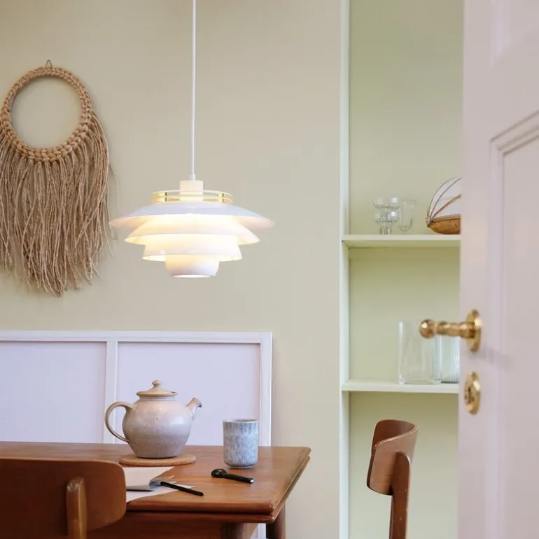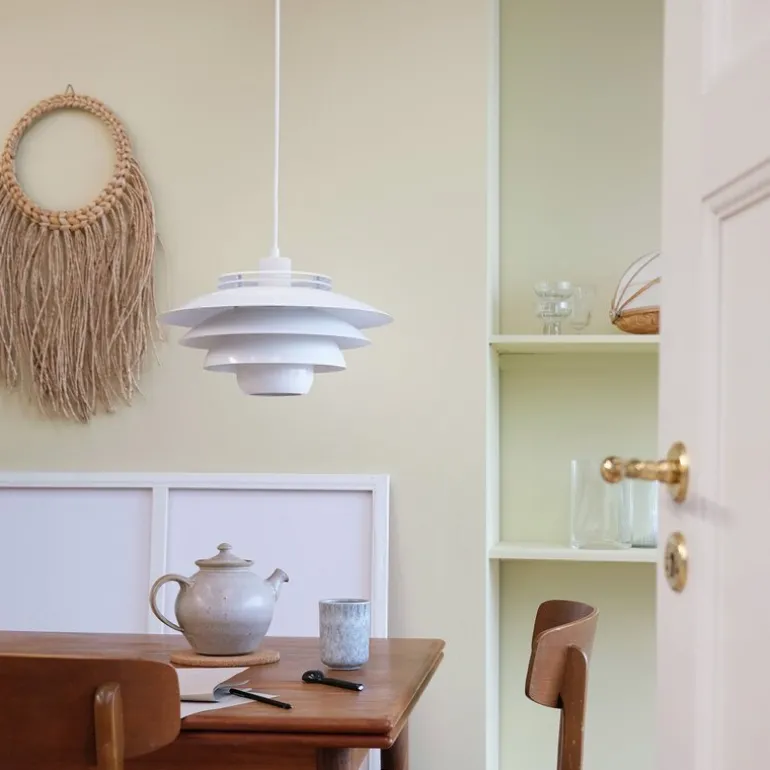 EJKA pendel 20 cm fra Dyberg Larsen er en vakker og funksjonell lampe som passer perfekt i det moderne hjem. Pendelen gir et rent og minimalistisk uttrykk som komplementerer enhver innredningsstil. De fire lagdelte skjermene sørger for en balansert lysfordeling, mens den åpne toppen sprer lyset oppover og ut i rommet, noe som skaper en lys og luftig atmosfære.