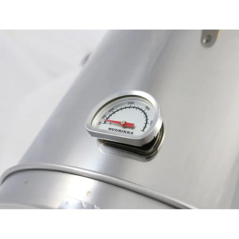 El-røykeovn av rustfritt stål, fra Muurikka, med tre-trinns temperaturregulering og innebygd termometer.