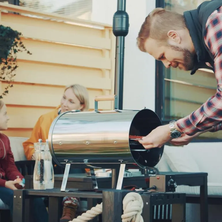 Takket være varmereguleringen kan også mer ømtålig mat tilberedes i røykeovnen, samtidig som råvarene bevarer sin saftighet. Ved hjelp av termometeret kan du følge røyktemperaturen. (Nivå 1 = 75–110 grader, nivå 2 = 150–185 grader, nivå 3 = 190–230 grader). Overflødig røyk og fuktighet slippes ut gjennom ventilen.
