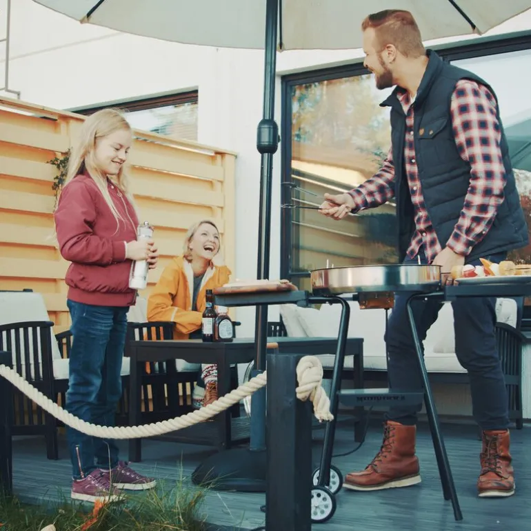 Effektiv og rask elektrisk grill med kompakt og solid stålvogn, to avtakbare sidebord i tre og en fast oppbevaringshylle. Med el-grillen kan du lage både lekre grillgrønnsaker og saftige biffer. Den trinnløse effektreguleringen gjør det enkelt å stille inn temperaturen.
