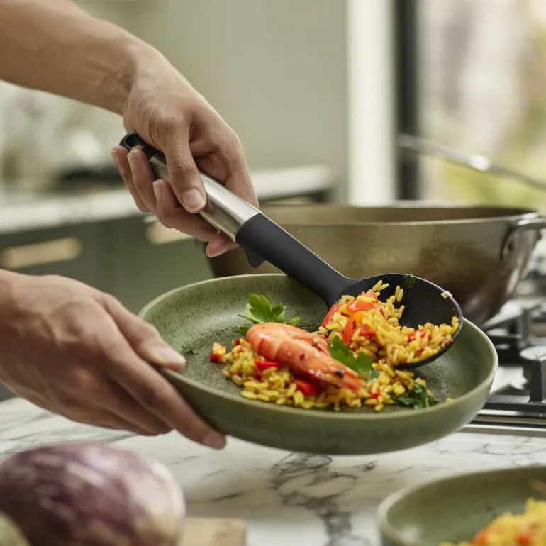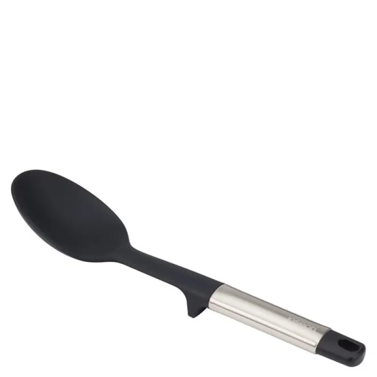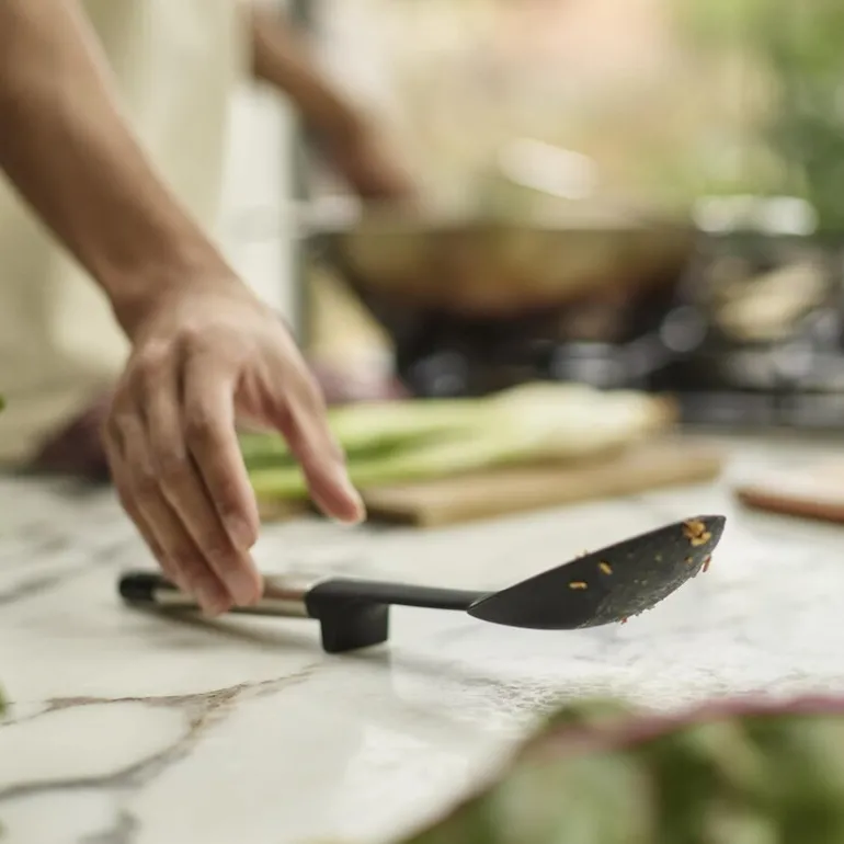 Elevate kjøkkenskje 6,7 cm i svart fra Joseph Joseph er ideelt for røreoppgaver som sauser, supper og gryteretter. Den smarte Elevate-teknologien bidrar til å forbedre kjøkkenhygienen og redusere søl ved å holde verktøyhodet oppe fra arbeidsflaten. Det vektede håndtaket med integrert verktøystøtte sørger for at skjeens hode aldri berører benken, noe som gjør det enklere å holde kjøkkenet rent.