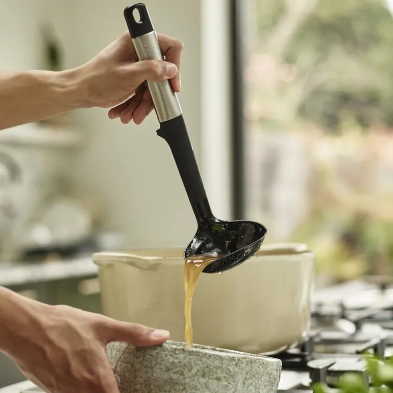 Elevate øse 9,5 cm fra Joseph Joseph i svart er en smart kjøkkenredskap som kombinerer funksjon og design. Med et dypt verktøyhode og en flat forkant er den perfekt for å øse sauser, supper og gryteretter fra både panner og gryter. Øsen er utstyrt med Joseph Josephs unike Elevate-teknologi, som er designet for å forbedre hygiene og redusere søl på kjøkkenet. Det vektede håndtaket og den integrerte verktøystøtten sørger for at verktøyhodet aldri berører arbeidsflaten når det legges ned, noe som reduserer behovet for ekstra rengjøring og holder benken ren.