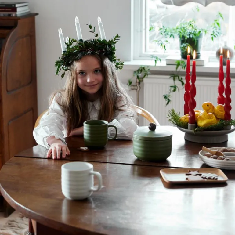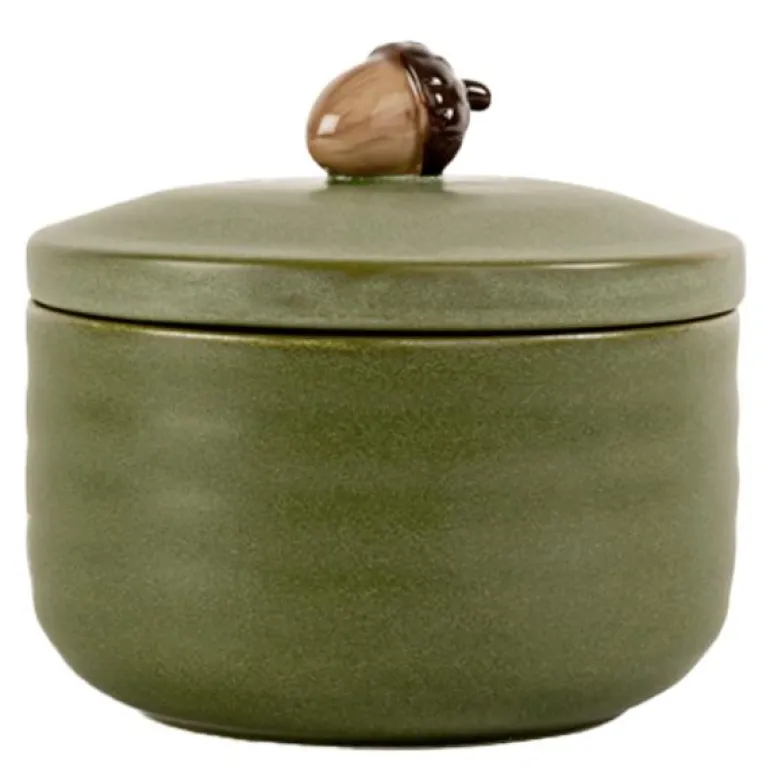 Krukker er perfekte gjemmesteder for ting du vil ha i nærheten, men som ikke alltid er så dekorative. Også som oppbevaring av ting du vil servere raskt, enkelt og vakkert. Ellen-krukken fungerer usedvanlig godt på kjøkkenet, men like godt på badet eller barnerommet. En søt krukke som kommer i to naturlige farger, grønn og off-white. Finnes i to størrelser der den større krukken har et ekorn på lokket og den mindre et eikenøtt. Laget av steintøy.