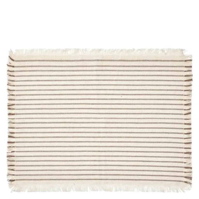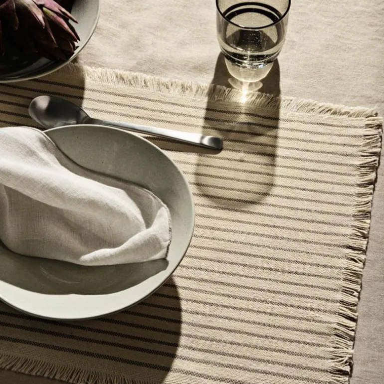 2 stykk stripete bordbrikker, Elouise 41,5×32 cm, i offwhite og fungi grey. Den lekre Elouise serien fra Broste Copenhagen er med til å skape hygge både hjemme og på hytta, både med sine dekkebrikker og løper. Serien er utført i den lekreste Ôko-Tex sertifiserte 100% bommuldskvalitet og tåler maskinvask på 30 grader. Såvel dekkebrikker og løpere finnes i 2 fargevarianter Off White/Fungi Grey og Offwhite/ Black. Dekkebrikkene kjøpes i sett m/ 2, imens løperne kjøpes enkeltvis.