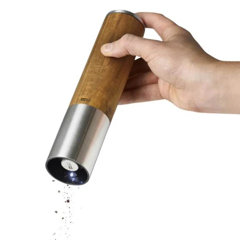 Brun, eMill.5 elektrisk salt eller pepperkvern fra AdHoc med LED-lys for optimal belysning. Vippemekanismen starter kvernen når den flyttes til en jevn posisjon. Ingen smuler på bordet. Trinnløs finjustering fra fin til grov. Luktfri og smakløs, samt absolutt rust- og slitefri høyytelses keramisk kvern CeraCut ®.