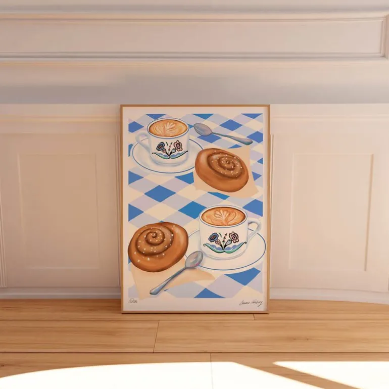 Emma Forsberg poster 30×40 cm fika fra Poster & Frame. Svensk fika for to. Svenske Berggren-inspirerte kinakrus for folkekunst viser en vintage-stemning på en blårutete duk, mens kanelboller (kanalbullar) og latte krever at du setter arbeidet ditt på pause for å smake på dem.