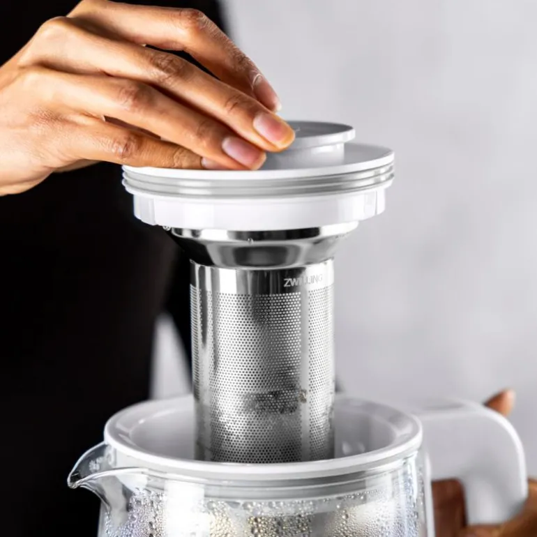 ZWILLING ENFINIGY® Kettle i elegant design med glasskanne i sølv med hvite detaljer & rustfri tesil 18/10 stål. Vannkokeren har timer, holde-varm-funksjon, ladeplate med LCD-berøringsskjerm og en kapasitet på 1,7 l. Ved hjelp av pre-boil-funksjonen kan vannkokeren først varme opp vannet til 100 ° C og deretter signalisere når ønsket temperatur er nådd. Etter det heller du ganske enkelt teen i silen i rustfritt stål. Den integrerte te-timeren signaliserer med et pip at teen er klar.