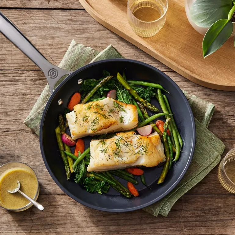 Le Creuset-stekepannen i Essential Non-Stick Ceramic serien på 26 cm i sort er den perfekte partneren for daglig matlaging, med en imponerende non-stick-ytelse som forenkler både steking og rengjøring. Uansett om du foretrekker å bruke olje eller smør, sikrer denne stekepannen jevn og perfekt bruning av dine favorittretter. Den er kompatibel med alle typer kokeplater, inkludert induksjon, og tåler ovnstemperaturer opptil 280 °C, eller 220 °C når den brukes med glasslokk.