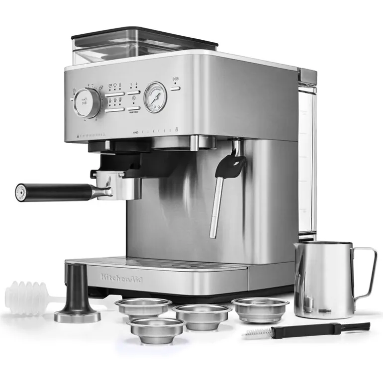 Espressomaskin 5KES6551, halvautomatisk med kaffekvern, fra KitchenAid kombinerer funksjonalitet og eleganse med sitt rustfritt stål-design og avanserte teknologi. Denne halvautomatiske espressomaskinen er utviklet for enkel og praktisk bruk, og tar espressobaserte drikker til et nytt nivå – fra klassisk espresso og americano til latte, cappuccino og mer.