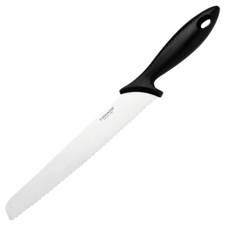 Fiskars, Essential brødkniv 23cm. Brødkniv med serratert blad for harde skorper. Alle kokker vet hvor viktig det er å ha kniver du til enhver tid kan stole på. Essential-serien er utviklet med nettopp dette i tankene. Knivene i Essential-serien er både praktiske og rimelige og leveres med et robust håndtak og en fingerstopp, noe som gir deg et trygt og samtidig komfortabelt grep. Så hvis du har tenkt til å utstyre kjøkkenet med de mest nødvendige kjøkkenredskapene, er Essential-serien et godt utgangspunkt.