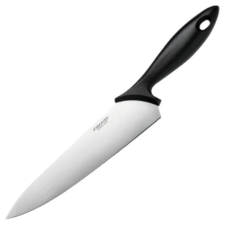 Fiskars, Essential kokkekniv 21cm. Klassisk utformet kokkekniv for de fleste oppgavene på kjøkkenet. Alle kokker vet hvor viktig det er å ha kniver du til enhver tid kan stole på. Essential-serien er utviklet med nettopp dette i tankene. Knivene i Essential-serien er både praktiske og rimelige og leveres med et robust håndtak og en fingerstopp, noe som gir deg et trygt og samtidig komfortabelt grep. Så hvis du har tenkt til å utstyre kjøkkenet med de mest nødvendige kjøkkenredskapene, er Essential-serien et godt utgangspunkt.